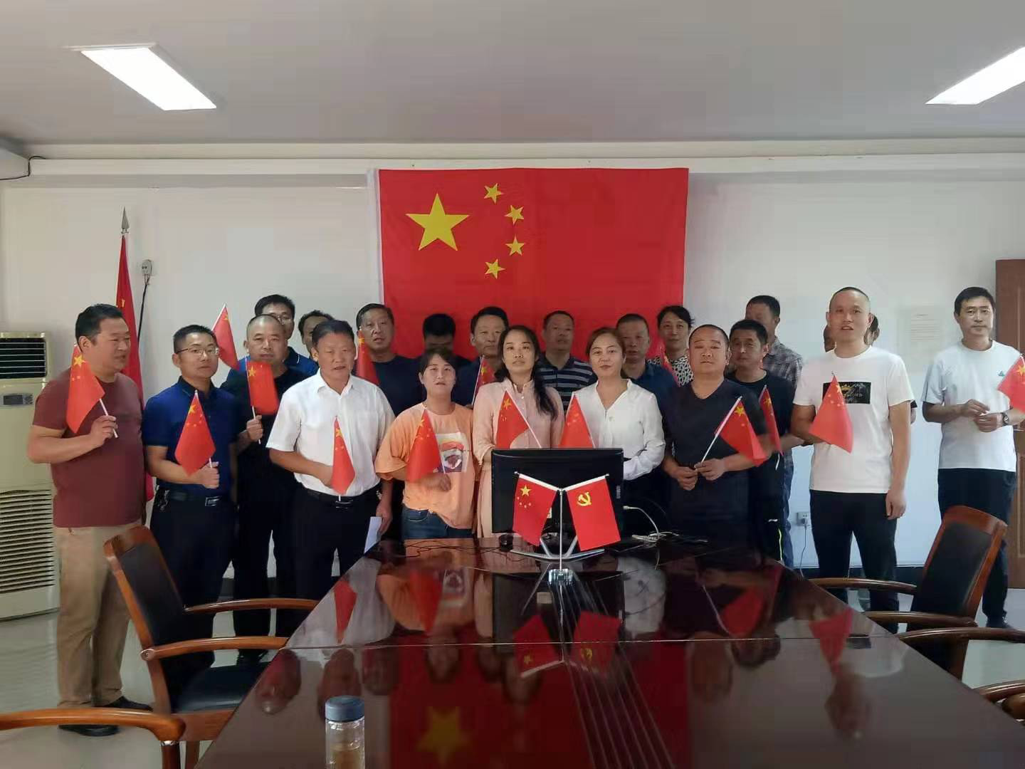 當(dāng)《義勇軍進(jìn)行曲》音樂響起,阜陽(yáng)市鹽業(yè)人揮舞著五星紅旗齊聲高唱“起來(lái),不愿做奴隸的人們……”,雄壯嘹亮的國(guó)歌聲,在黨員活動(dòng)室內(nèi)久久回蕩。隨后,大家又齊聲高歌《歌唱祖國(guó)》,“五星紅旗迎風(fēng)飄揚(yáng),勝利歌聲多么響亮”,唱出對(duì)中華人民共和國(guó)成立70周年最美好的祝福和熱愛。