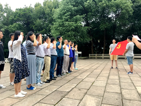 在蕪湖市烈士陵園紀念碑下,全體黨員懷著對烈士的崇高敬意肅立默哀,深切緬懷無數革命先烈為新中國成立做出的巨大犧牲和杰出貢獻。全體黨員面對鮮紅的黨旗,高舉右手,重溫了入黨誓詞。