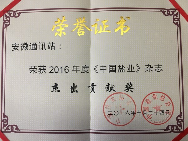 安徽鹽業(yè)通訊站榮獲《中國鹽業(yè)》雜志2016年度先進(jìn)通訊站杰出貢獻(xiàn)獎