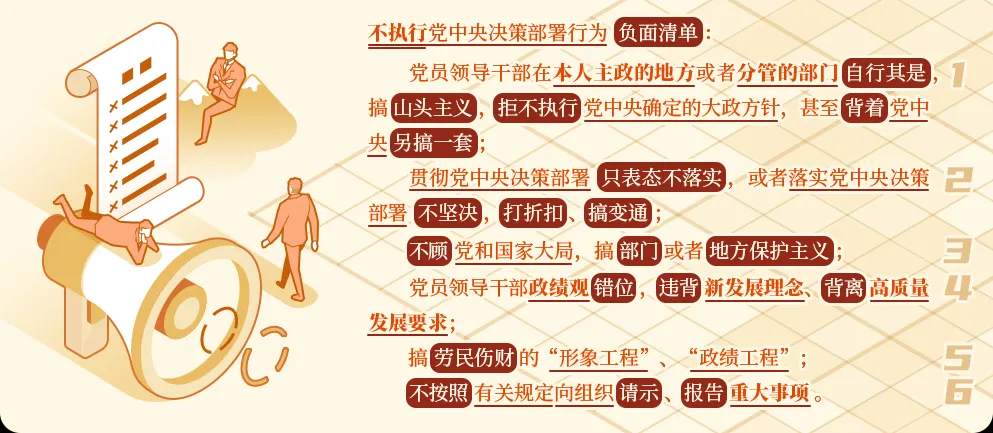 其中,前兩種行為嚴(yán)重程度不同:拒不執(zhí)行黨中央確定的大政方針行為危害更大,性質(zhì)更惡劣,一旦存在就要給予撤銷黨內(nèi)職務(wù)、留黨察看或者開除黨籍處分;貫徹黨中央決策部署只表態(tài)不落實,或者落實黨中央決策部署不堅決,打折扣、搞變通行為,在政治上造成不良影響或者嚴(yán)重后果的,視情節(jié)輕重給予警告直至開除黨籍處分。不顧黨和國家大局,搞部門或者地方保護主義的,同樣視情節(jié)輕重給予警告直至開除黨籍處分。
