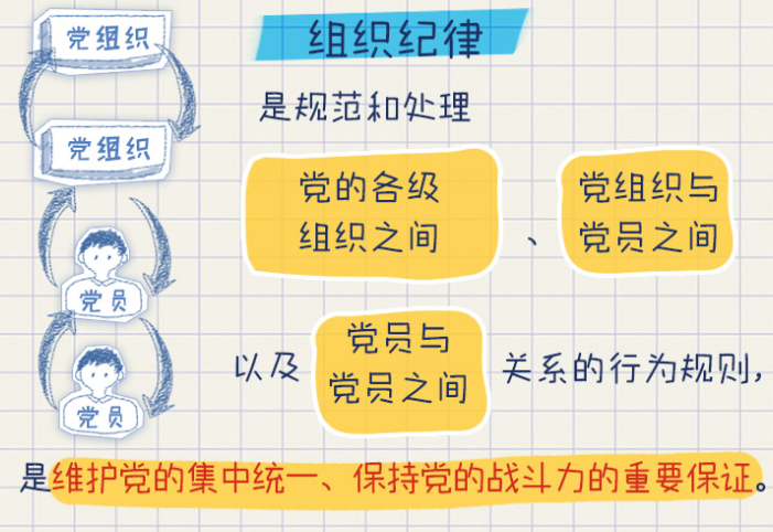 組織紀律著眼于黨員和黨組織之間的關系,規范的是黨組織和黨員遵守和維護黨在組織上團結統一的行為。一個人一旦入了黨,就要有強烈的組織意識和組織觀念,就必須嚴格遵守組織紀律。
