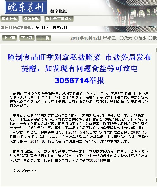 《皖東晨刊》:市鹽務局發布提醒 腌制食品旺季別拿私鹽腌菜
