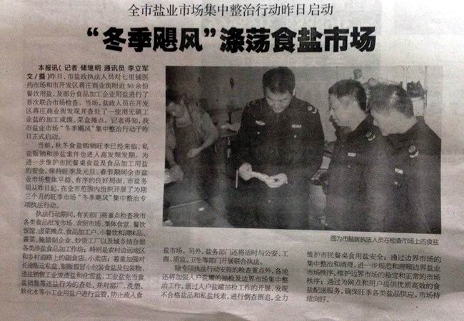 昨日,市鹽政執(zhí)法人員對(duì)七里鋪醫(yī)藥市場(chǎng)和市開發(fā)區(qū)蔣莊商業(yè)街附近50余份餐飲用鹽,及部分食品加工企業(yè)用鹽進(jìn)行了首次聯(lián)合市場(chǎng)檢查。當(dāng)場(chǎng),鹽政人員在開發(fā)區(qū)蔣莊商業(yè)街發(fā)現(xiàn)并查處了一使用無(wú)碘工業(yè)鹽的加工咸饃、菜盒攤點(diǎn)。記者得知,我市鹽業(yè)市場(chǎng)“冬季颶風(fēng)”集中整治行動(dòng)于昨日正式啟動(dòng)。