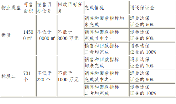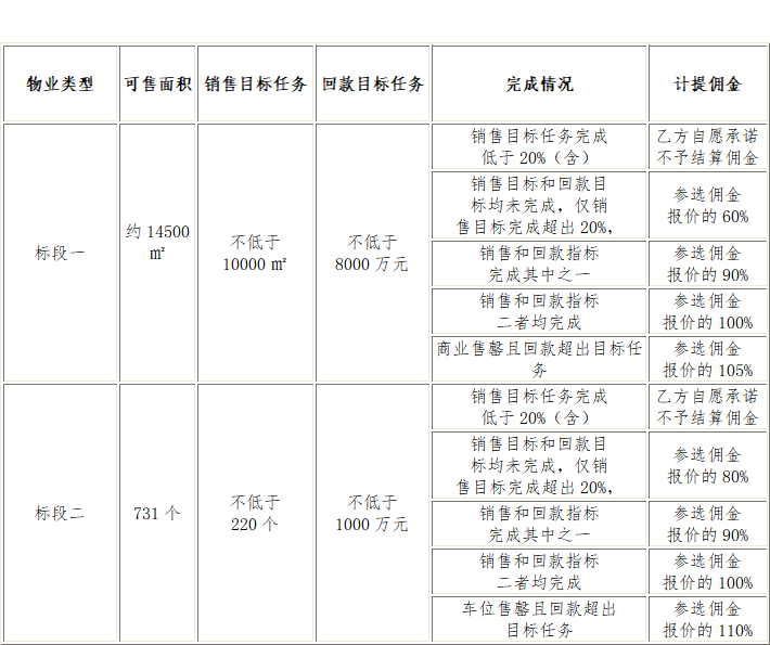 七、投標限價:本次比選文件中標段一和標段二所涉及的業態在合作期限、銷售完成目標、回款目標、分銷團隊人員配備、傭金計提點數、以及履約保證金等設定了最低報價指標,低于此指標的按廢標處理。