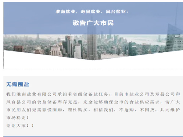 為有效阻止食鹽搶購風(fēng)波蔓延,全省各級鹽業(yè)公司一方面充分利用微信公眾號、地方性媒體、微信朋友圈等線上渠道發(fā)布正面宣傳信息,另一方面積極組織人員進(jìn)商超、下市場,通過面對面的宣傳形式,引導(dǎo)廣大消費者不搶購、不囤貨、理性購鹽。