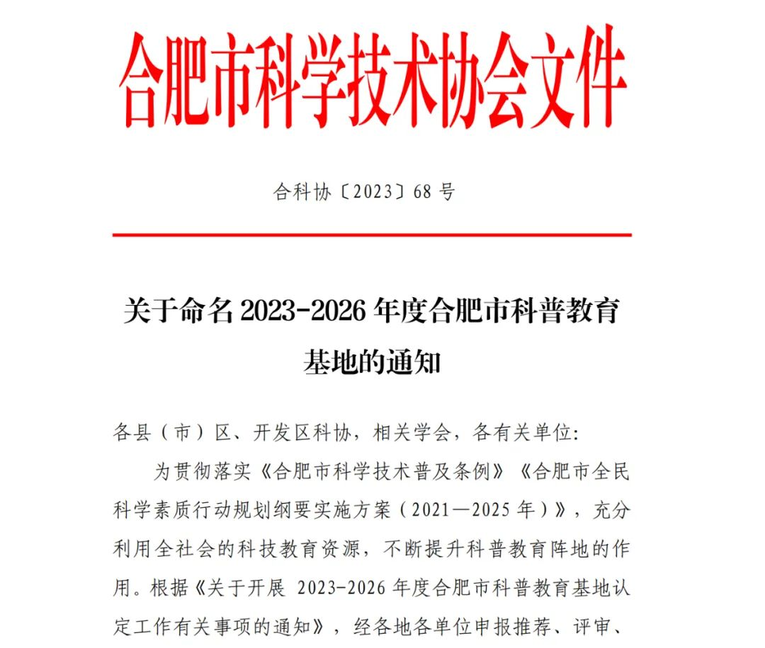 9月21日,合肥市科學技術協會經各地各單位申報推薦、評審、驗收、公示等程序,正式發文公布命名合肥鹽業等126家場館為“2023-2026年度合肥市科普教育基地”。
