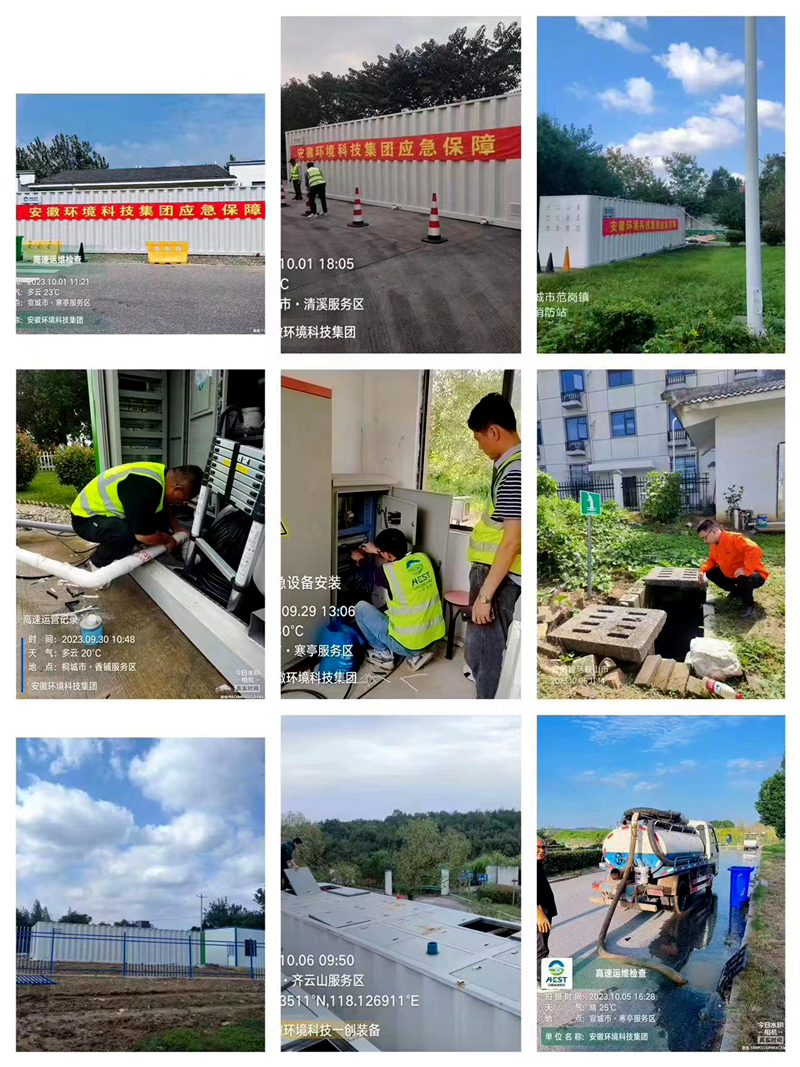 2023年中秋、國慶假期,是安徽省生態環境產業集團掛牌后的第一個長假。為確保全省高速服務區污水處理項目假日期間穩定達標運營,保障人民群眾舒心出行,環境公司針對全省高速服務區高人流量、高運維壓力的特點,制定兩節期間運維巡檢方案和巡檢值班表,抽調本部與各子項目公司30余人協同作戰,在人流量大和生態敏感區的重點服務區安排專人駐場負責污水站點運維,在各站點提前儲存藥劑和維修物品,同時緊急調配三臺一體化設備安裝在寒亭、香鋪、清溪三個大流量服務區以策萬全。